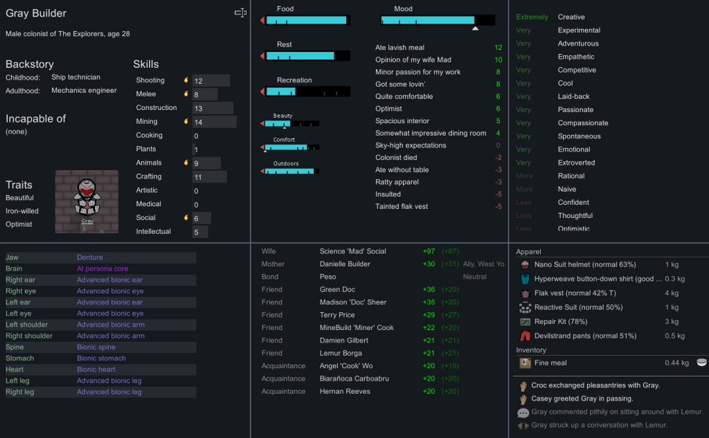 Lors de ma dernière partie, Gray en couple avec Mad, a malheureusement été victime d’un tire de bolter de centipède en pleine tête. Heureusement Mad a effectuer de nombreuses recherches sur les membres bioniques et a réussi à implanter une IA dans le cerveau de Gray ! Seul bémol, parfois l’IA devient maléfique et prends le controle du corps de Gray quand celui-ci est équipé d’une arme…