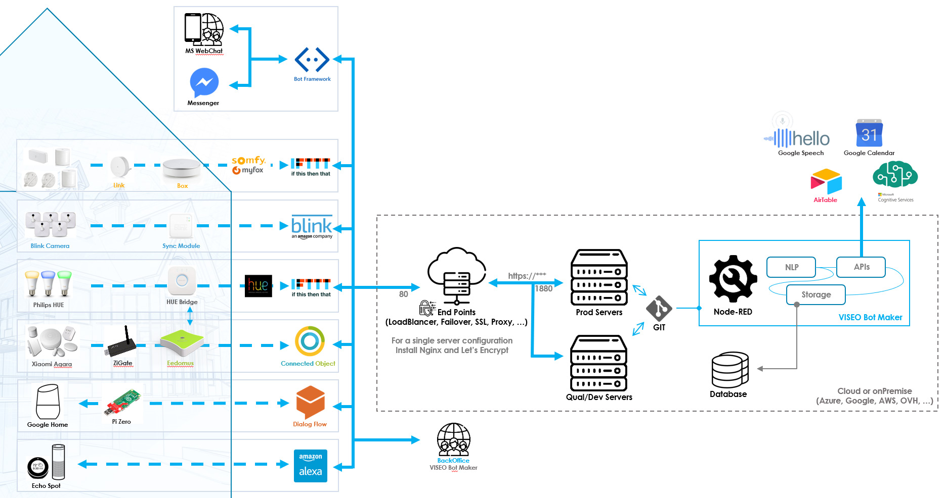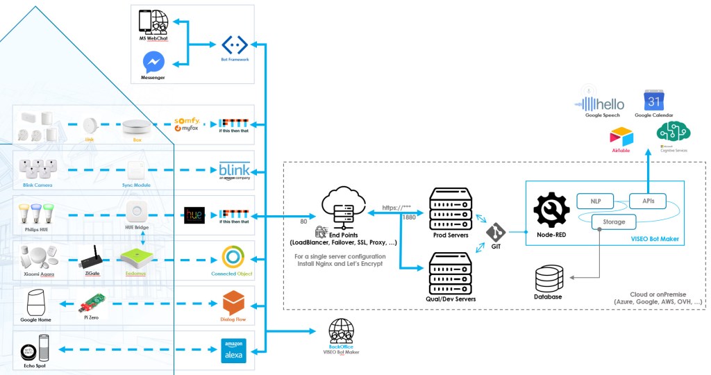 De nos jours, l’interaction avec la maison doit aussi pouvoir se faire depuis la voiture, le travail, en mobilité sur son smartphone, etc … le cerveau de SARAH est donc hébergé dans le cloud, orchestré par Node-RED sur un Ubuntu dans (Azure, GCP, OVH, etc …)