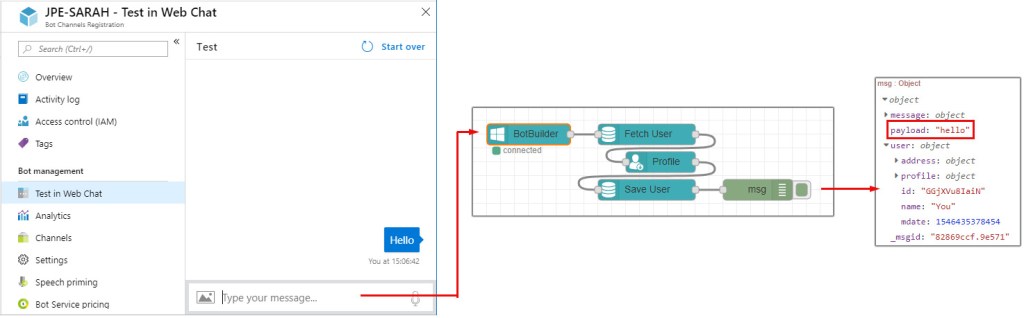 Côté Node-RED la brique BotBuilder va réceptionner les messages envoyés par Azure (WebChat, Faceboo, Slack, …), sauvegarder l’utilisateur puis afficher le message dans la zone de debug.