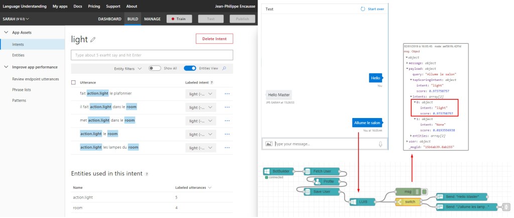 Le principe d’un service de traitement du langage naturel est très simple. Il faut l’alimenter avec un ensemble de phrases (utterance) afin de lui indiquer le sens globale (intent) comme « allumer les lumières » et préciser les variables (entitées) « comme allumer les lumières du salon » (et non éteindre le bureau) ce qui permet de lui apprendre des originalités telle que « il fait noir ici » qui au final se transformeront en intention « light » pour le switch.