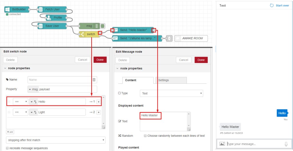 Pour réagir au message, il suffit d’utiliser les briques de Node-RED, le switch permet de comparer le message à une liste de réponse pour ensuite aller déclencher une action et répondre avec la brique message.
