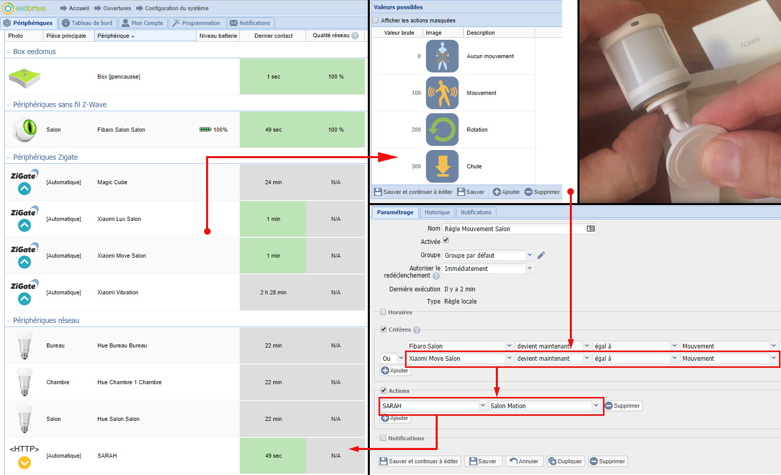 Une fois dans SARAH les différents capteurs vont déclencher des actions de plus haut niveau comme par exemple: allumer une pièce en fonction de la luminosité, du mouvement, du niveaux de bruit, de l’état de l’alarme et de l’heure de la journée…