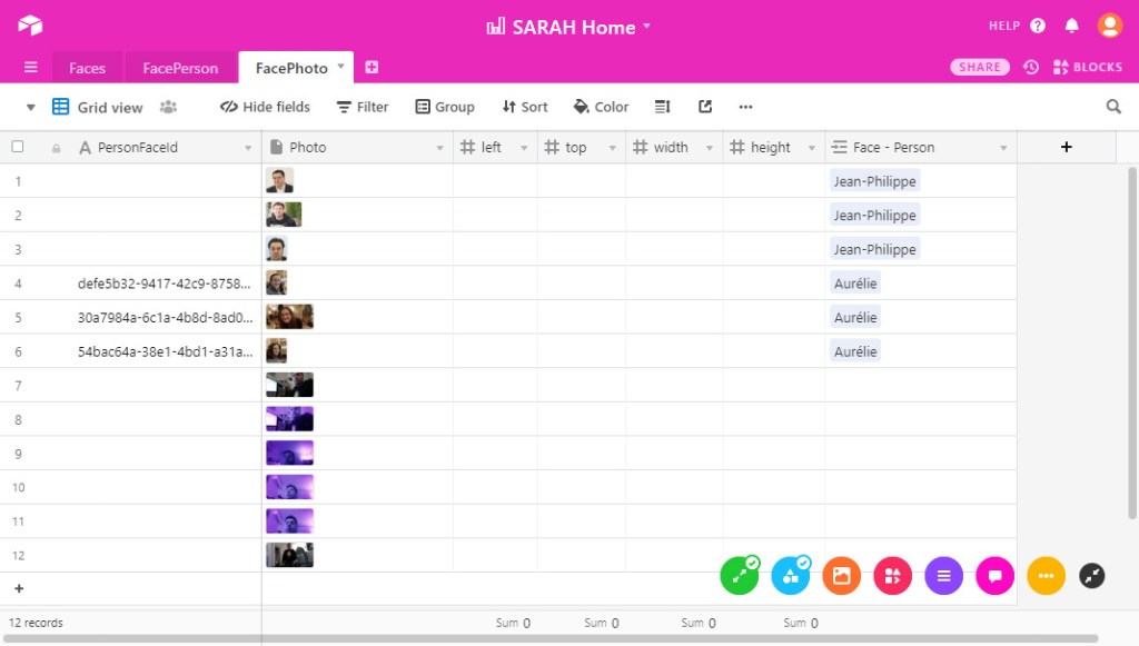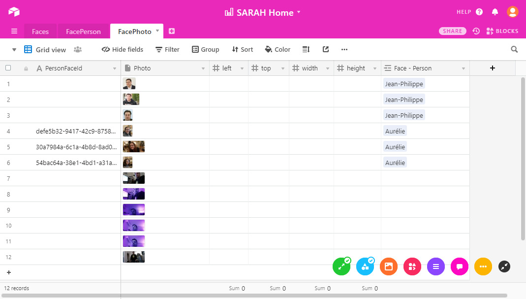 Les visages associés à une personne sont stockés dans AirTable ce qui facilite les mises à jour. Typiquement pour améliorer la reconnaissance.