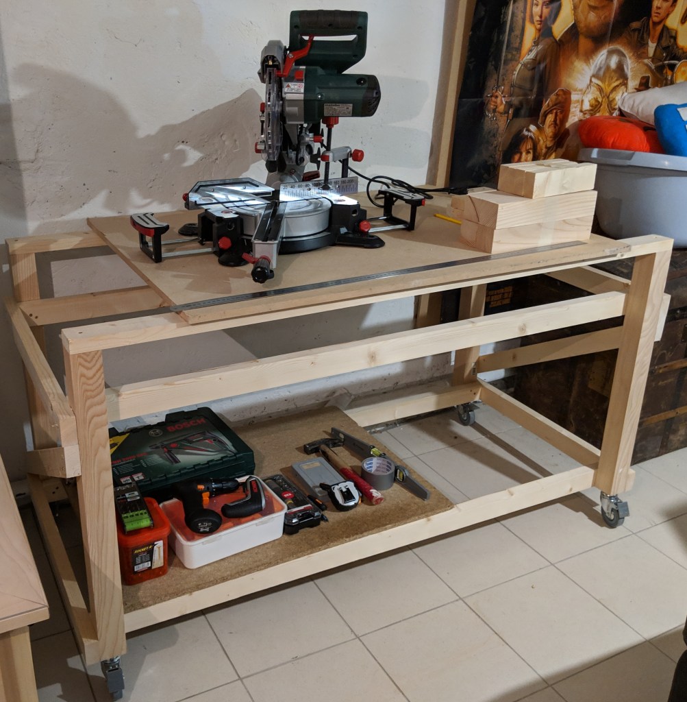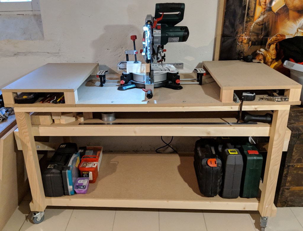 - J’ai mis des roulettes avec frein afin de pouvoir ranger et déplacer l’établi. La scie à onglet à une très grande envergure.