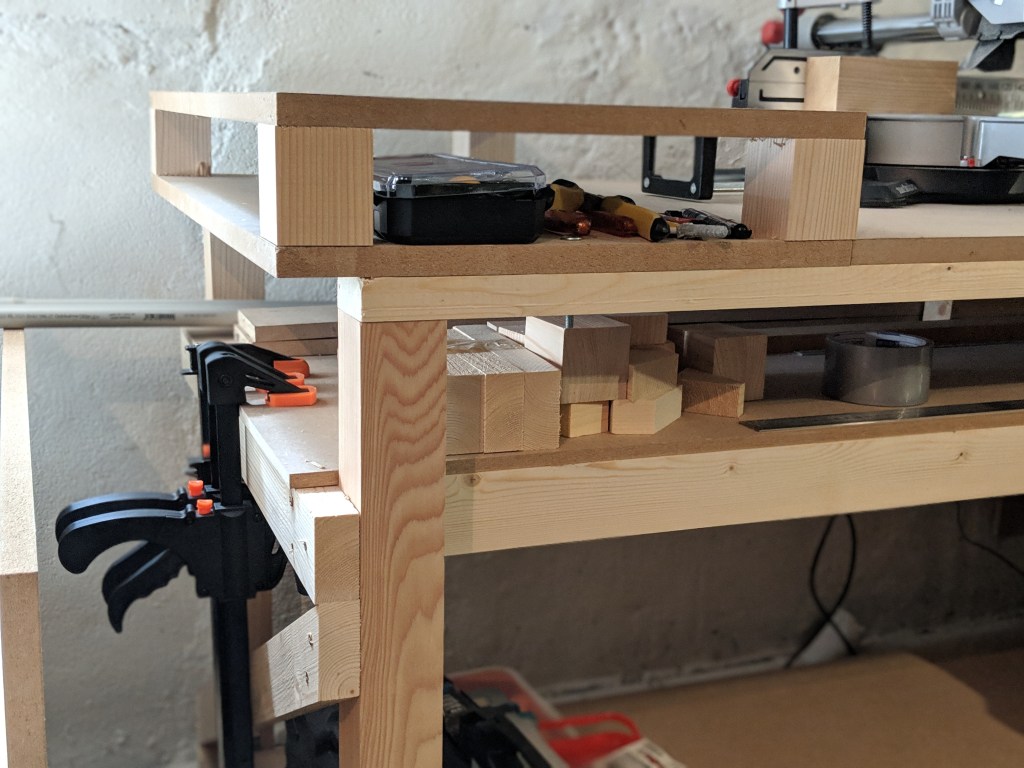 - J’ai rajouté 2 grandes planches pour ranger mon matériel sous l’établi et les chutes de bois dans la longueur.