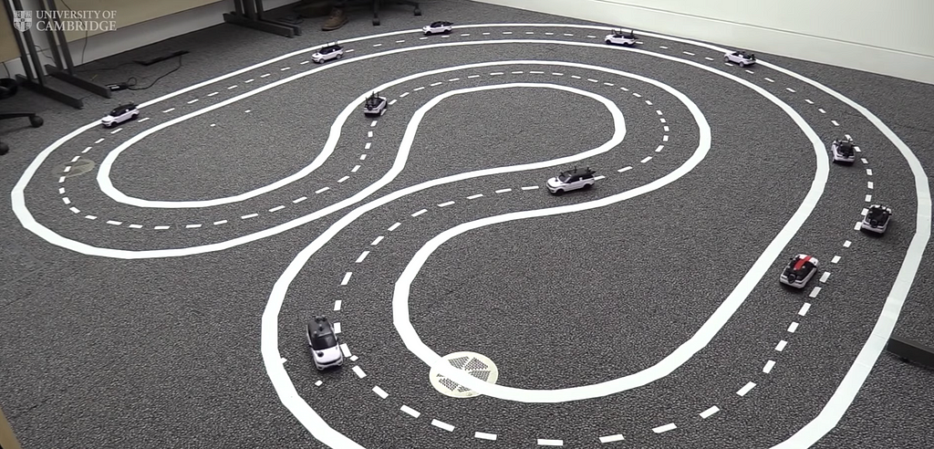 Researchers from the University of Cambridge have deployed a fleet of 1:24 scale autonomous Range Rovers to explore how cars can communicate and work together. Results are promising, with cooperative driving improving traffic flow by 35% in normal driving operation, and a staggering 45% when driving more aggressively.