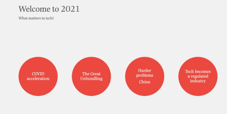 Covid brought shock and a lot of broken habits to tech, but mostly, it accelerates everything that was already changing. 20 trillion dollars of retail, brands, TV and advertising is being overturned, and software is remaking everything from cars to pharma. Meanwhile, China has more smartphone users than Europe and the USA combined, and India is close behind – technology and innovation will be much more widely spread. For that and lots of other reasons, tech is becoming a regulated industry, but if we step over the slogans, what does that actually mean? Tech is entering its second 50 years.