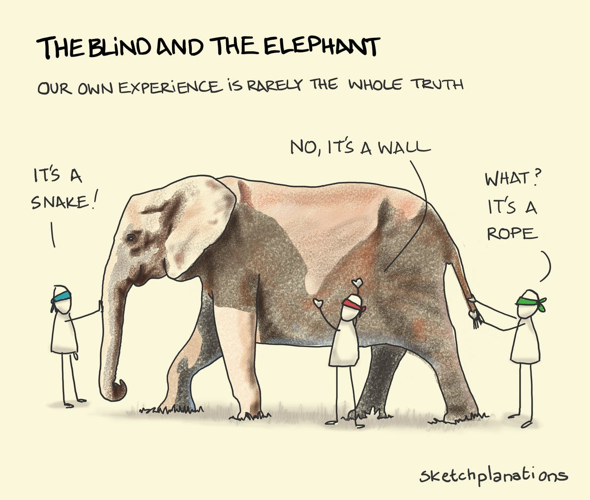 It's an old, old Eastern story about some blind men who encounter an elephant. As the blind make sense of what each feels it's also a memorable illustration of how our own views are shaped by our subjective experience and, as so often, that we don't see the full picture. In various versions the men may argue over what it is, convinced they themselves must be right, or collaborate to identify the elephant together.
