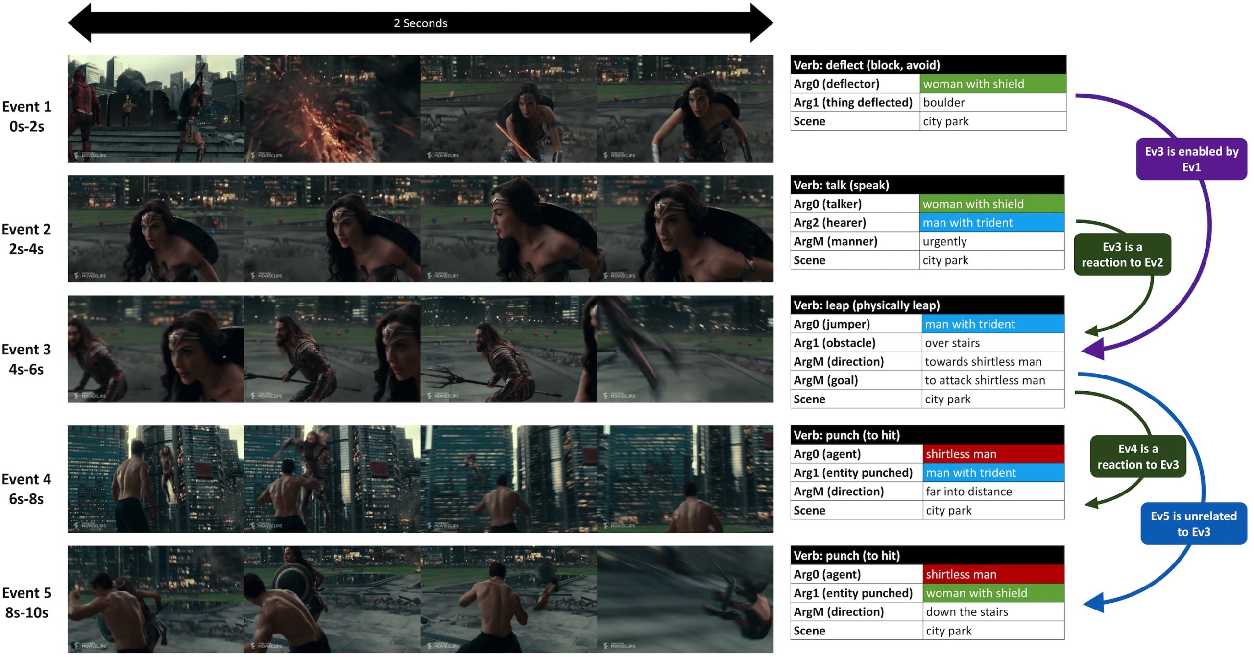 VidSitu is a large-scale dataset containing diverse 10-second videos from movies depicting complex situations (a collection of related events). Events in the video are richly annotated at 2-second intervals with verbs, semantic-roles, entity co-references, and event relations.