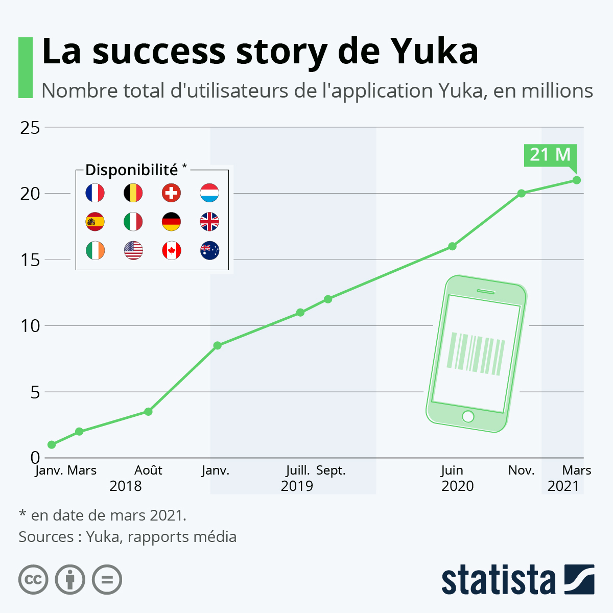 Ce graphique montre l'évolution du nombre d'utilisateurs et la disponibilité de l'application Yuka dans le monde.