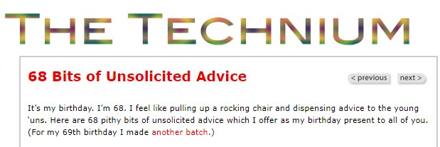 It’s my birthday. I’m 68. I feel like pulling up a rocking chair and dispensing advice to the young ‘uns. Here are 68 pithy bits of unsolicited advice which I offer as my birthday present to all of you.
