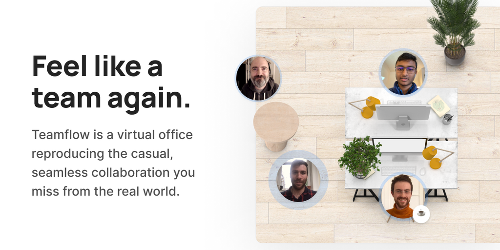 Teamflow is a virtual office for your team to hang out. Bring back the camaraderie of being in the office, the energy of working in the same room, the spontaneity of hallway conversations. ⠀ The joy of feeling like a team again.
