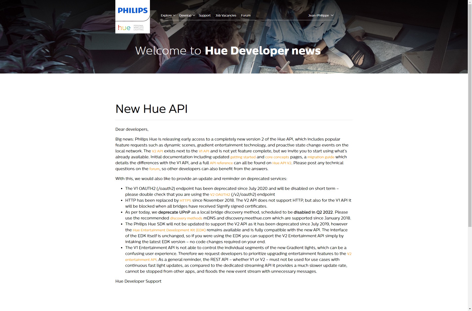 Philips Hue is releasing early access to a completely new version 2 of the Hue API, which includes popular feature requests such as dynamic scenes, gradient entertainment technology, and proactive state change events on the local network. The V2 API exists next to the V1 API and is not yet feature complete, but we invite you to start using what’s already available. Initial documentation including updated getting started and core concepts pages, a migration guide which details the differences with the V1 API, and a full API reference can all be found on Hue API V2. Please post any technical questions on the forum, so other developers can also benefit from the answers.
