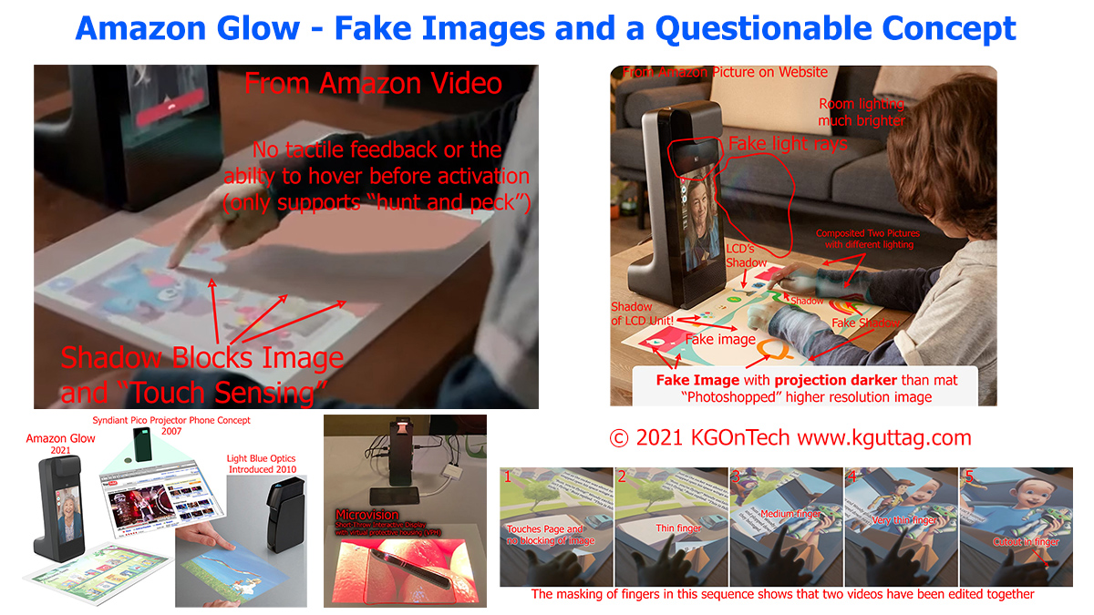 Last week Amazon announced several (not so) new concepts. My attention was grabbed by all the fake images associated with the Amazon Glow. The Glow incorporates a small “down projector” (projects down on a surface). I then got curious as to what projector technology Amazon might be using (and will give my best guess). There are so many ways in which the Glow down projector is a flawed concept, and it only has gotten worse with age.