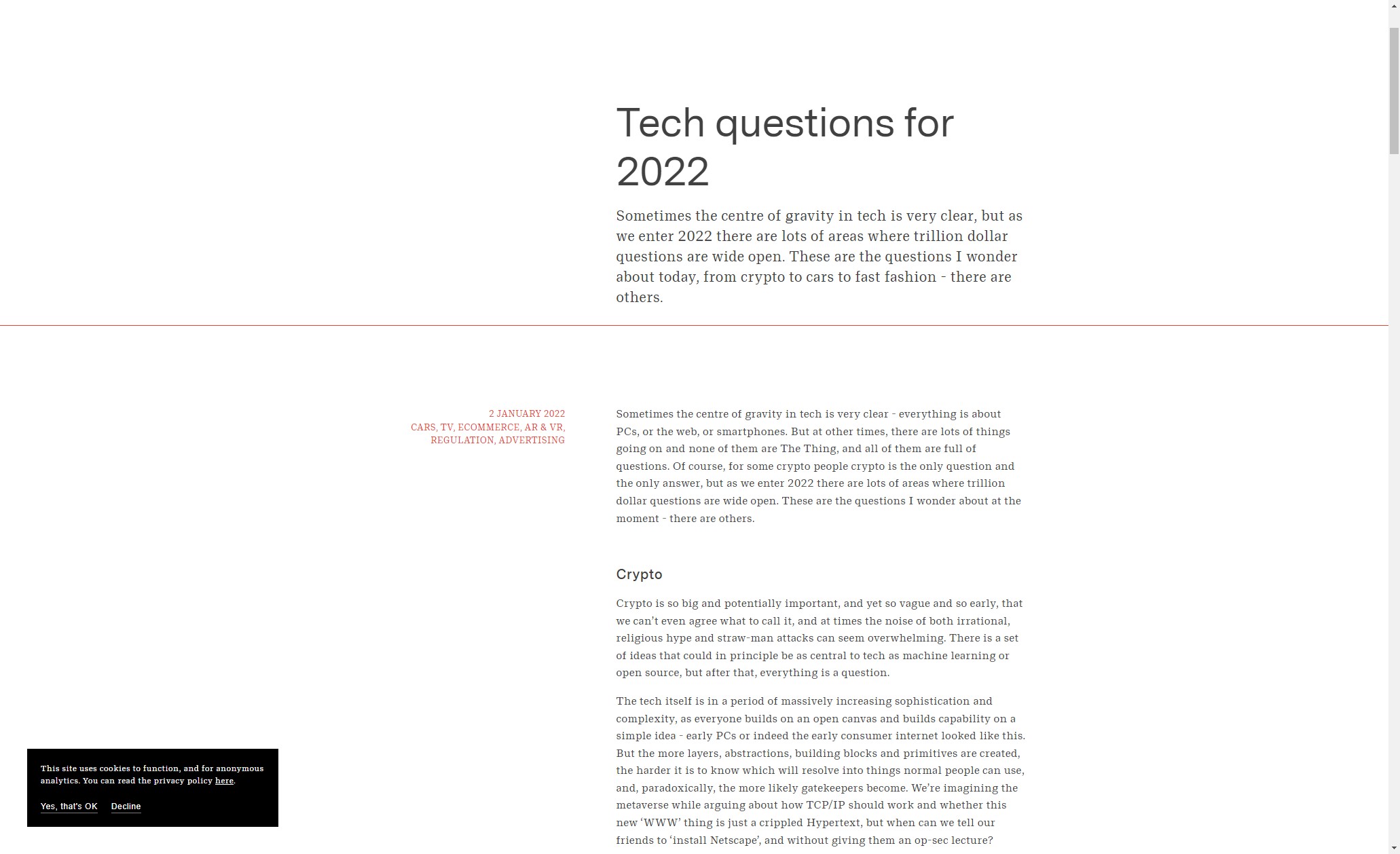 Sometimes the centre of gravity in tech is very clear, but as we enter 2022 there are lots of areas where trillion dollar questions are wide open. These are the questions I wonder about today, from crypto to cars to fast fashion – there are others.