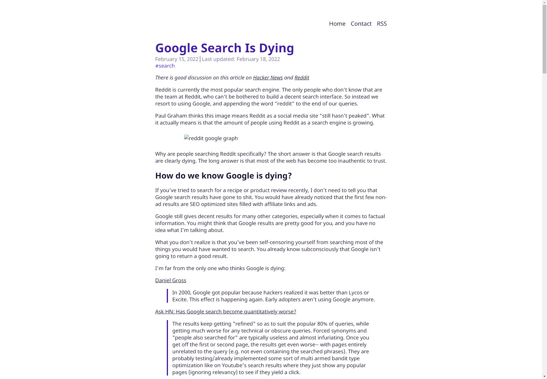 Reddit is currently the most popular search engine. The only people who don’t know that are the team at Reddit, who can’t be bothered to build a decent search interface. So instead we resort to using Google, and appending the word “reddit” to the end of our queries.