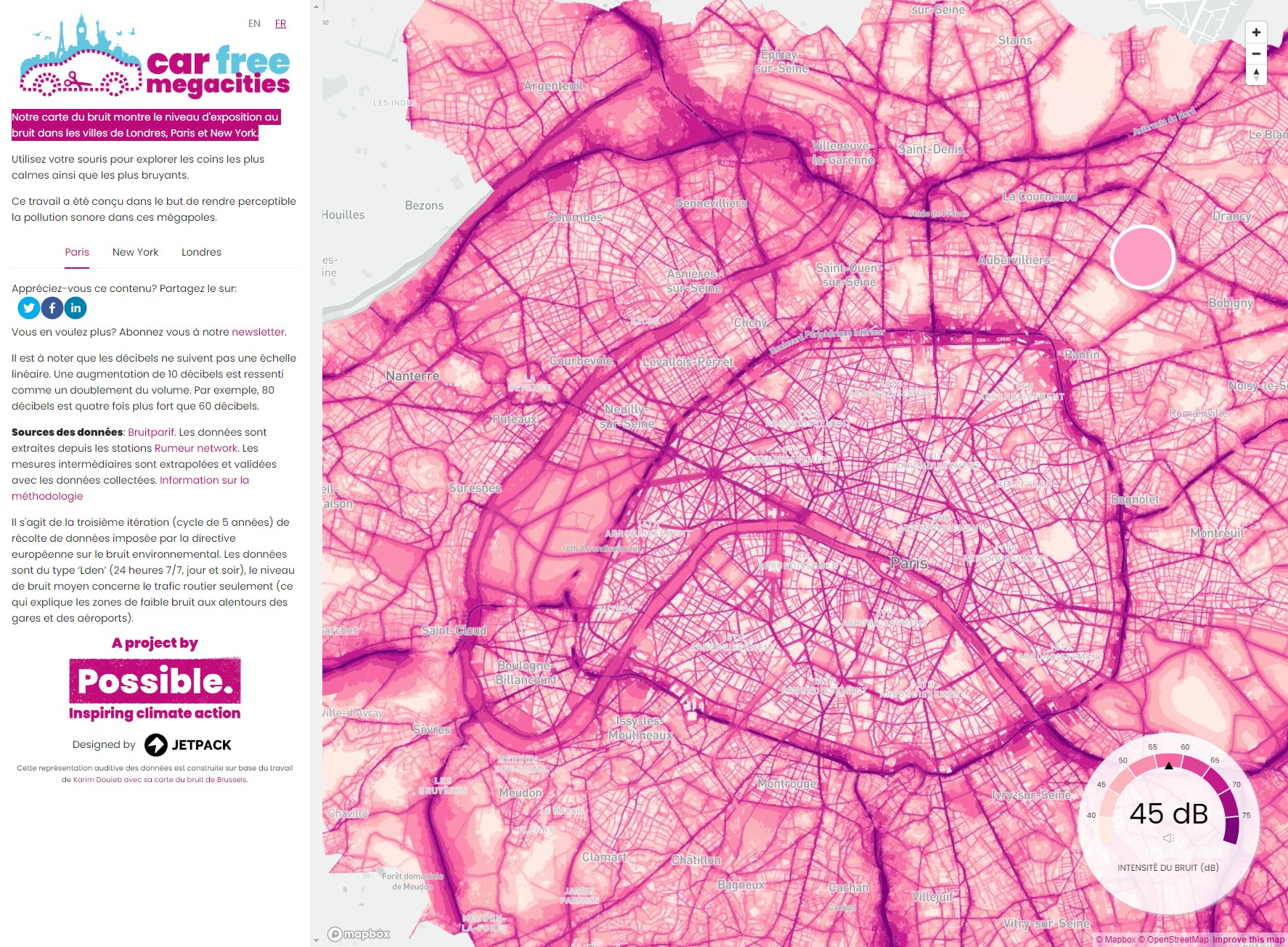 Notre carte du bruit montre le niveau d'exposition au bruit dans les villes de Londres, Paris et New York.