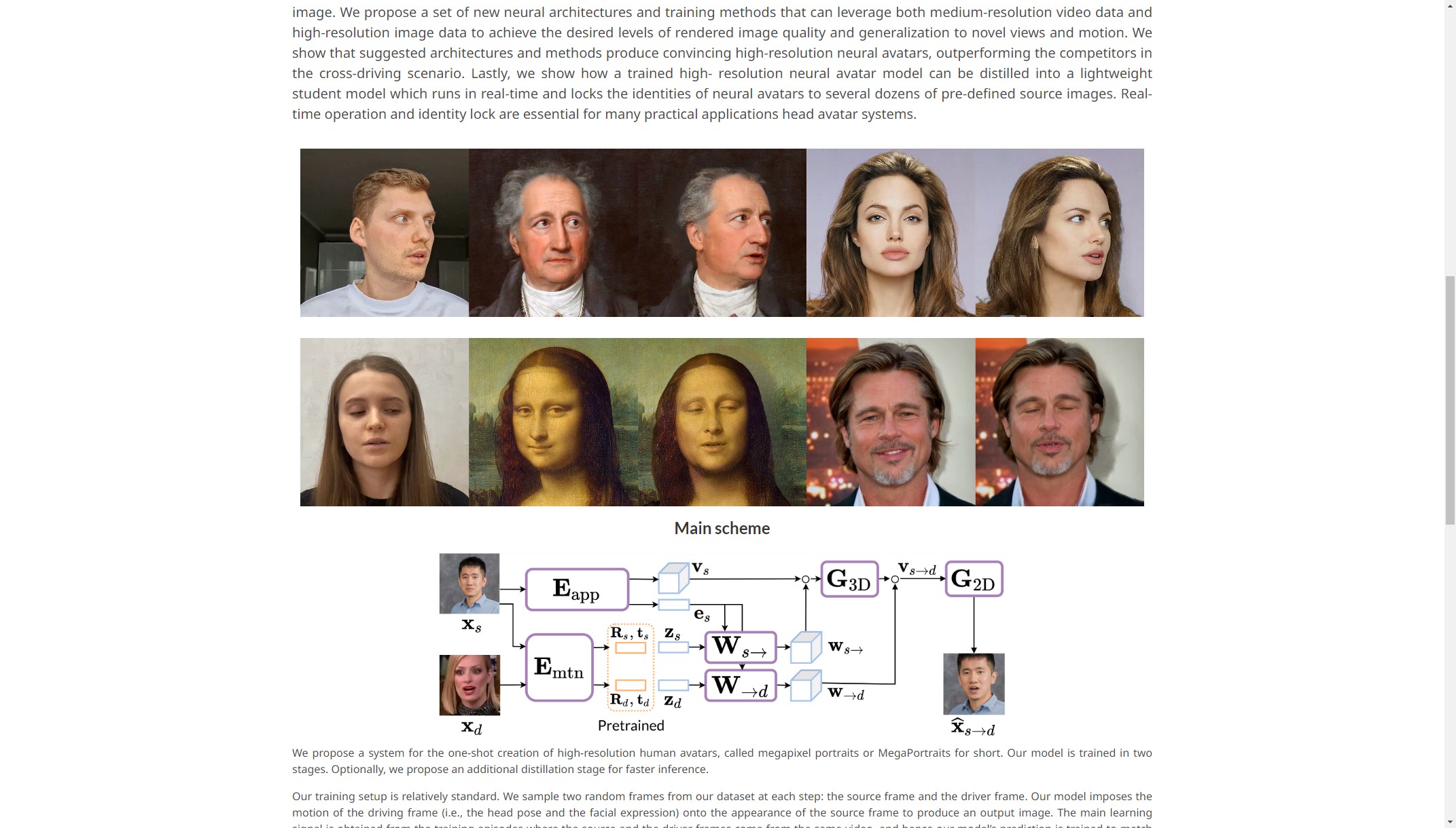 It samples two random frames from the dataset at each step: the source frame and the driver frame. The model imposes the motion of the driving frame (i.e., the head pose and the facial expression) onto the appearance of the source frame to produce an output image.