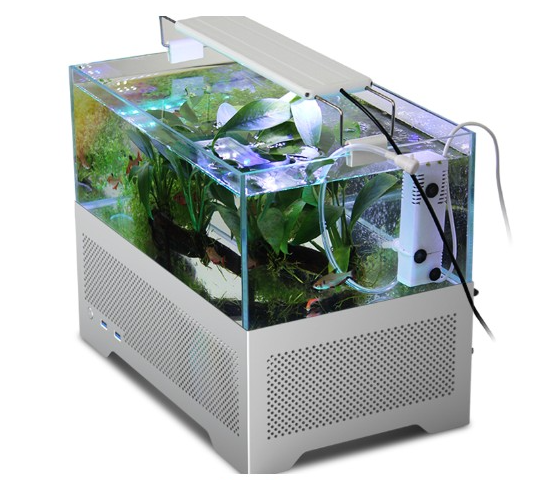 Belle connerie Marketing mêlant Design et Watercooling. Les gens qui ont eu un aquarium et un PC savent que ça va mal se terminer…