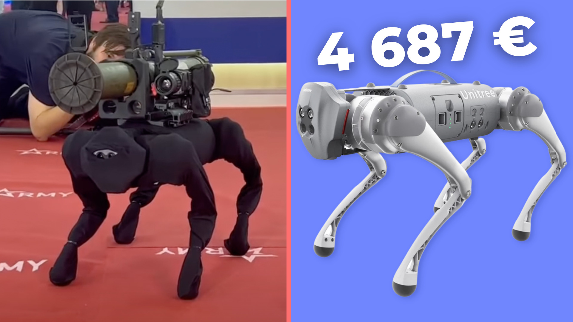 Une entreprise russe a présenté un engin à quatre pattes équipé d'un lance-roquette et enveloppé d'un tissu noir lors d'un salon de l'armement en Russie. Il s'agit en réalité d'un modèle développé par une startup chinoise, vendu à bon prix, sans réelle utilisation sur un champ de bataille. On est encore loin du