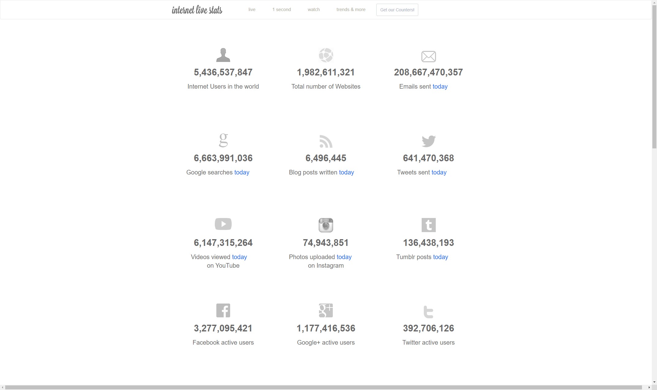 Watch the Internet as it grows in real time and monitor social media usage: Internet users, websites, blog posts, Facebook, Google+, Twitter, and Pinterest users. Visualize the total number of emails, Google searches, YouTube videos, Tumblr posts, Instagram photos, in 1 second. Historical trends, statistics, infographics and live data visualization