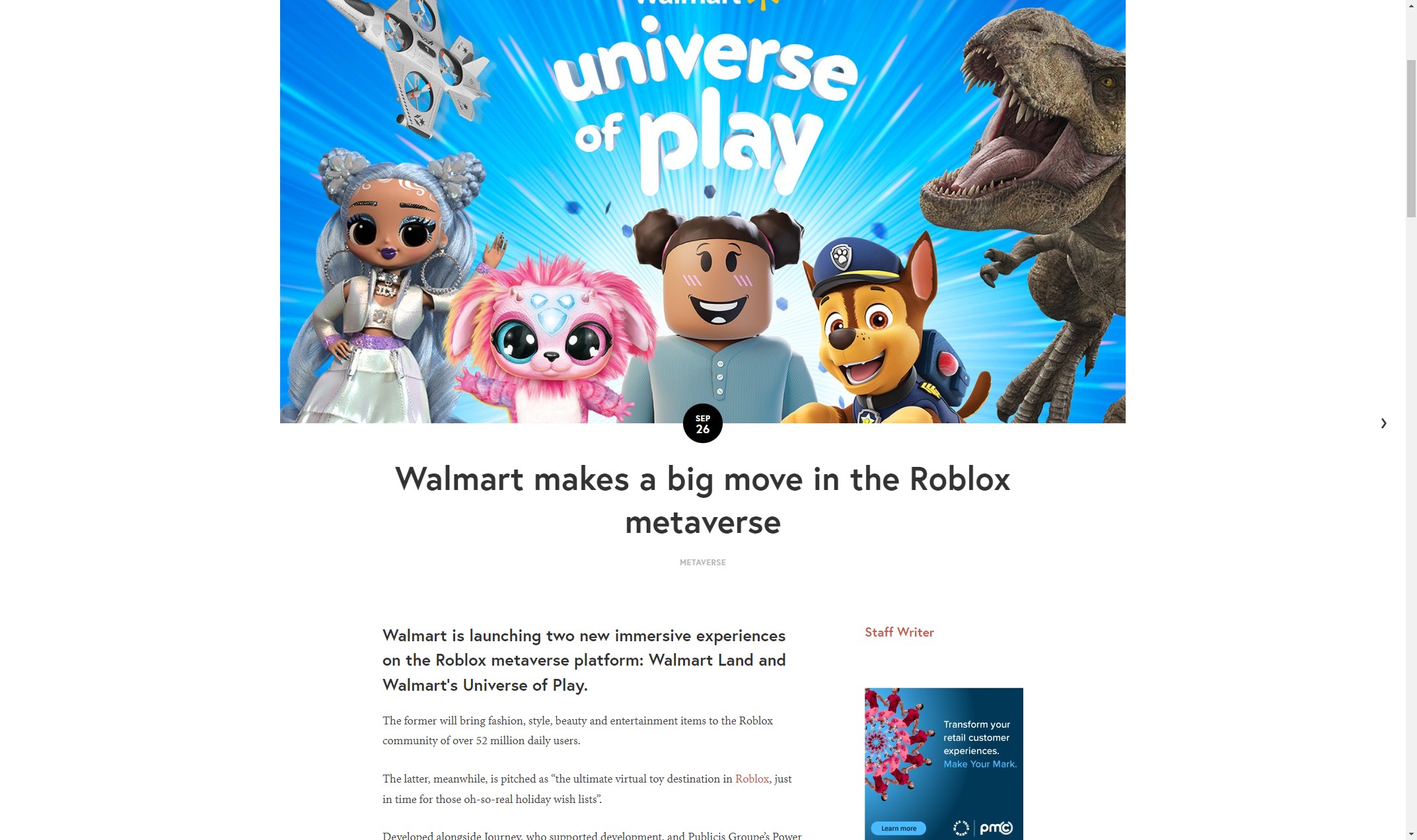 Walmart is launching two new immersive experiences on the Roblox metaverse platform: Walmart Land and Walmart’s Universe of Play.