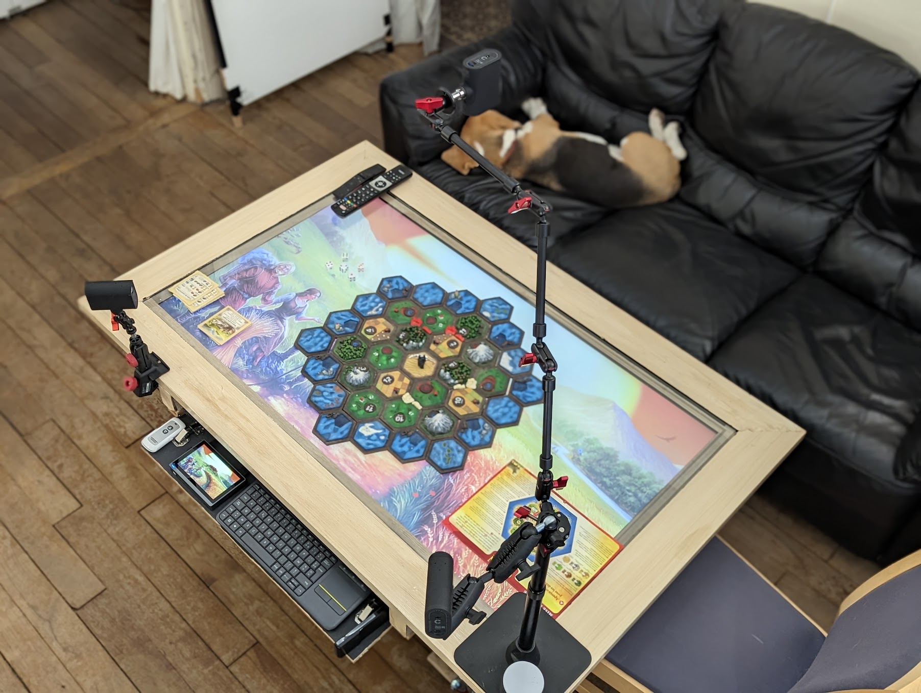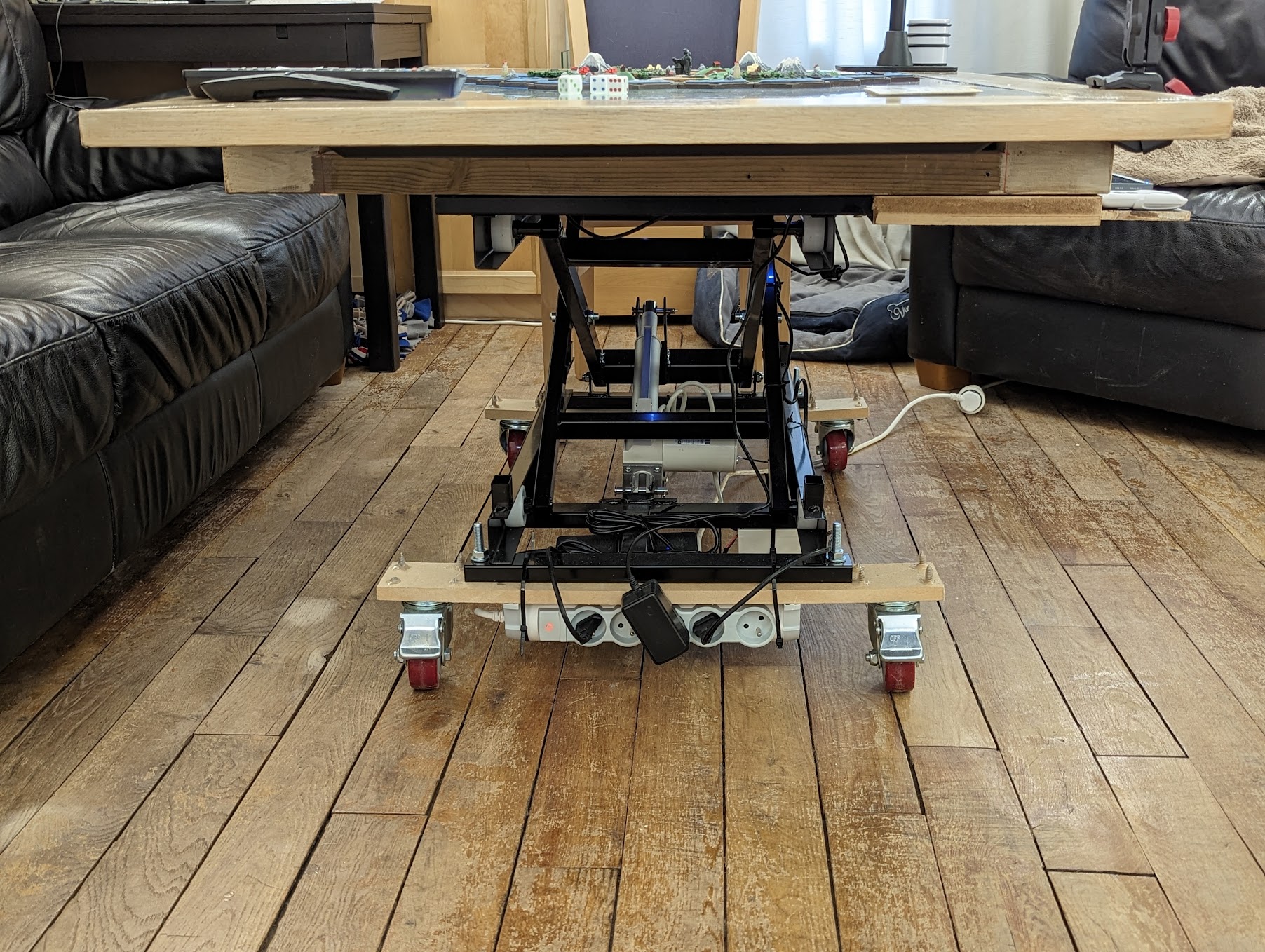 Nouvelle mise à jour de ma (2ème) table connectée. J'ai remplacé les charnières par un mécanisme de levage me permettant de passer du café, au repas jusqu'a debout (Jeux de Plateau).