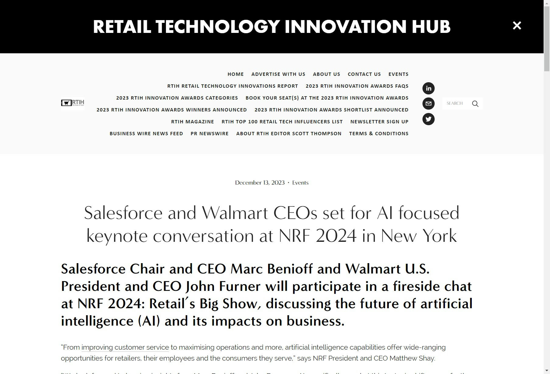 Marc Benioff, PDG de Salesforce, et John Furner, PDG de Walmart U.S., participeront à une conversation en tête-à-tête lors du NRF 2024: Retail's Big Show, pour discuter de l'avenir de l'intelligence artificielle (IA) et de son impact sur les entreprises. Leur session, le 14 janvier, explorera les opportunités actuelles et futures en IA, et expliquera pourquoi les entreprises investissent maintenant dans cette technologie. La convention annuelle se tiendra à New York du 14 au 16 janvier et devrait rassembler plus de 6 200 marques et environ 40 000 participants de près de 100 pays.