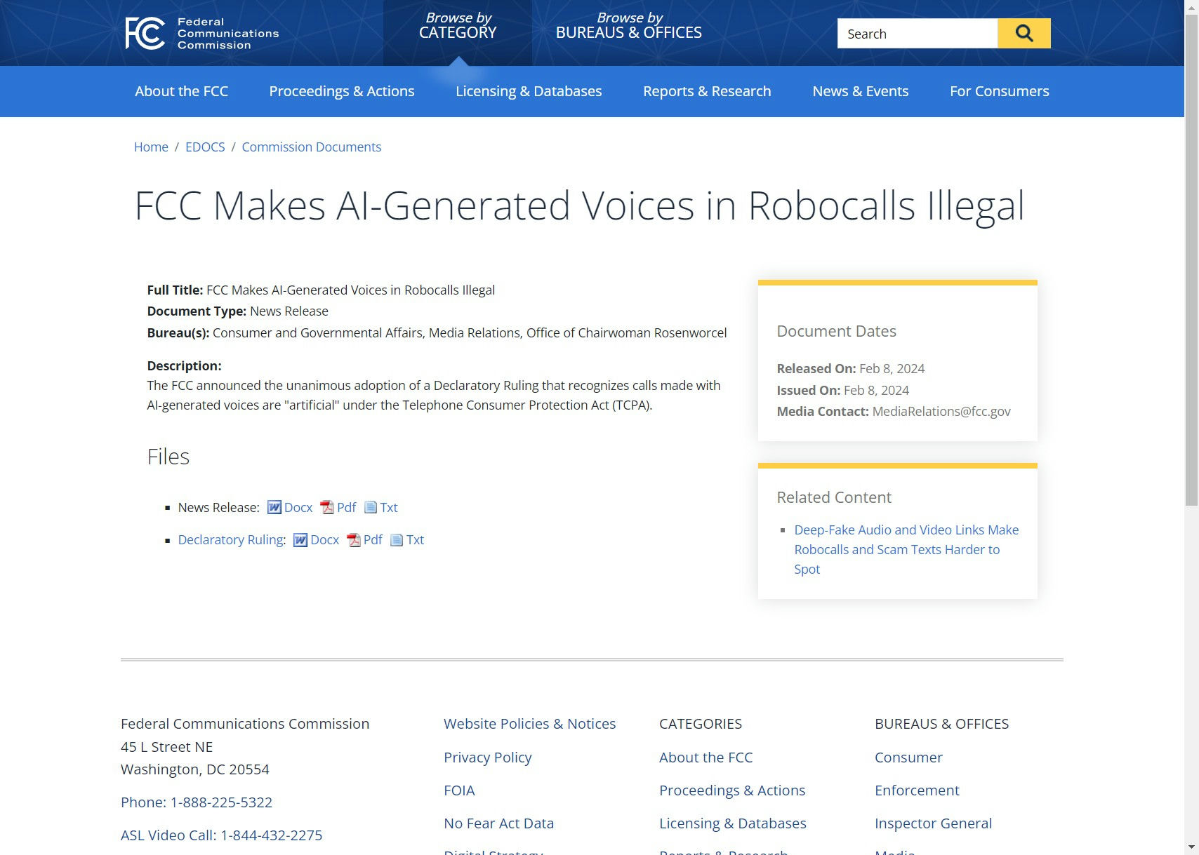 La FCC (Federal Communications Commission) a annoncé à l'unanimité l'adoption d'une Décision déclaratoire qui reconnaît que les appels effectués avec des voix générées par l'intelligence artificielle sont considérés comme "artificiels" en vertu de la Loi sur la protection des consommateurs de télécommunications (TCPA).