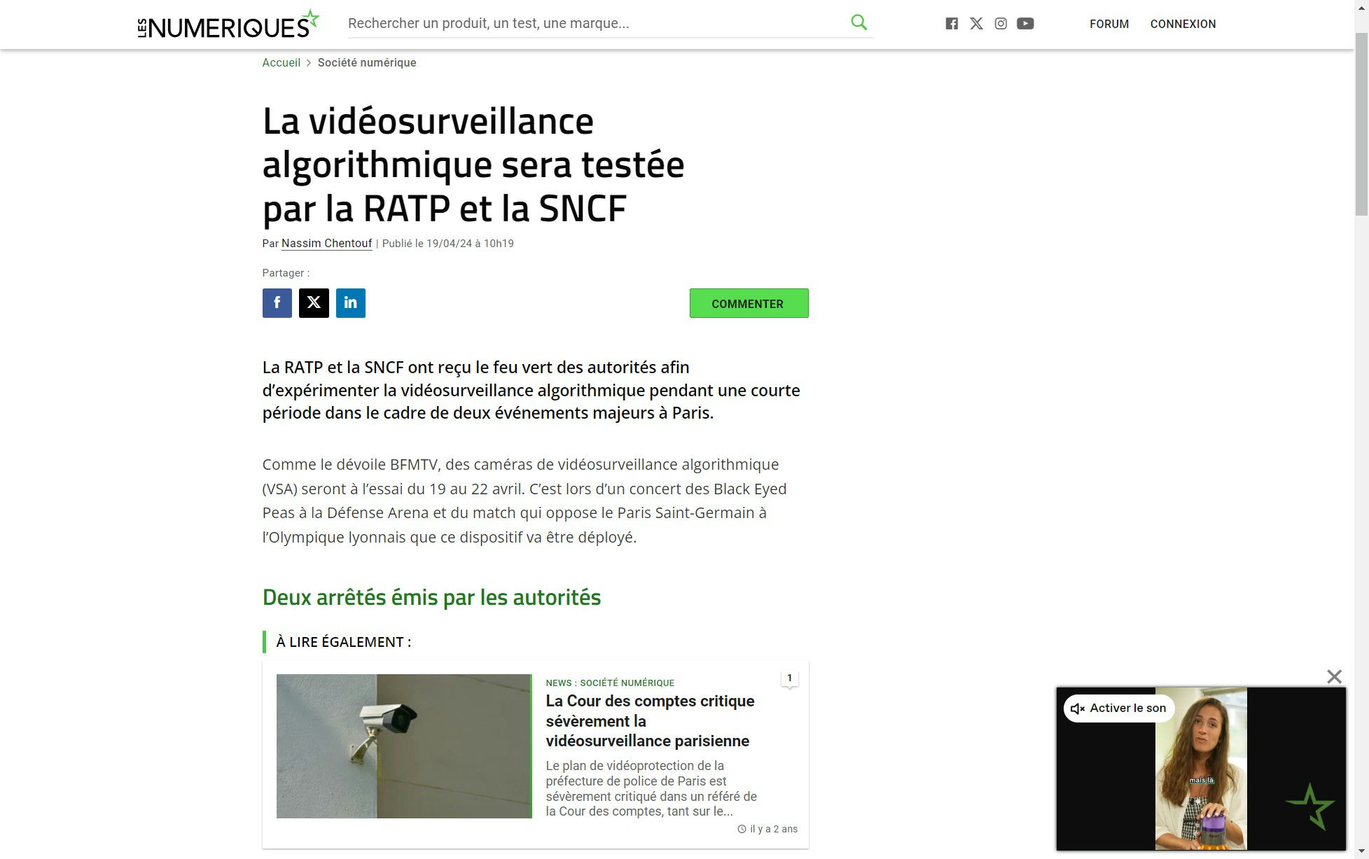 La RATP et la SNCF ont obtenu l'autorisation d'expérimenter la vidéosurveillance algorithmique lors de deux événements à Paris. Des caméras de vidéosurveillance algorithmique seront utilisées lors d'un concert des Black Eyed Peas à la Défense Arena et lors du match entre le Paris Saint-Germain et l'Olympique lyonnais. Les autorités ont émis des arrêtés pour permettre cette expérimentation. La VSA permettra de repérer les individus dans des zones interdites, de détecter les bagages abandonnés et les mouvements de foule. La technologie ne utilise pas de reconnaissance faciale et sera également testée lors des Jeux olympiques 2024.